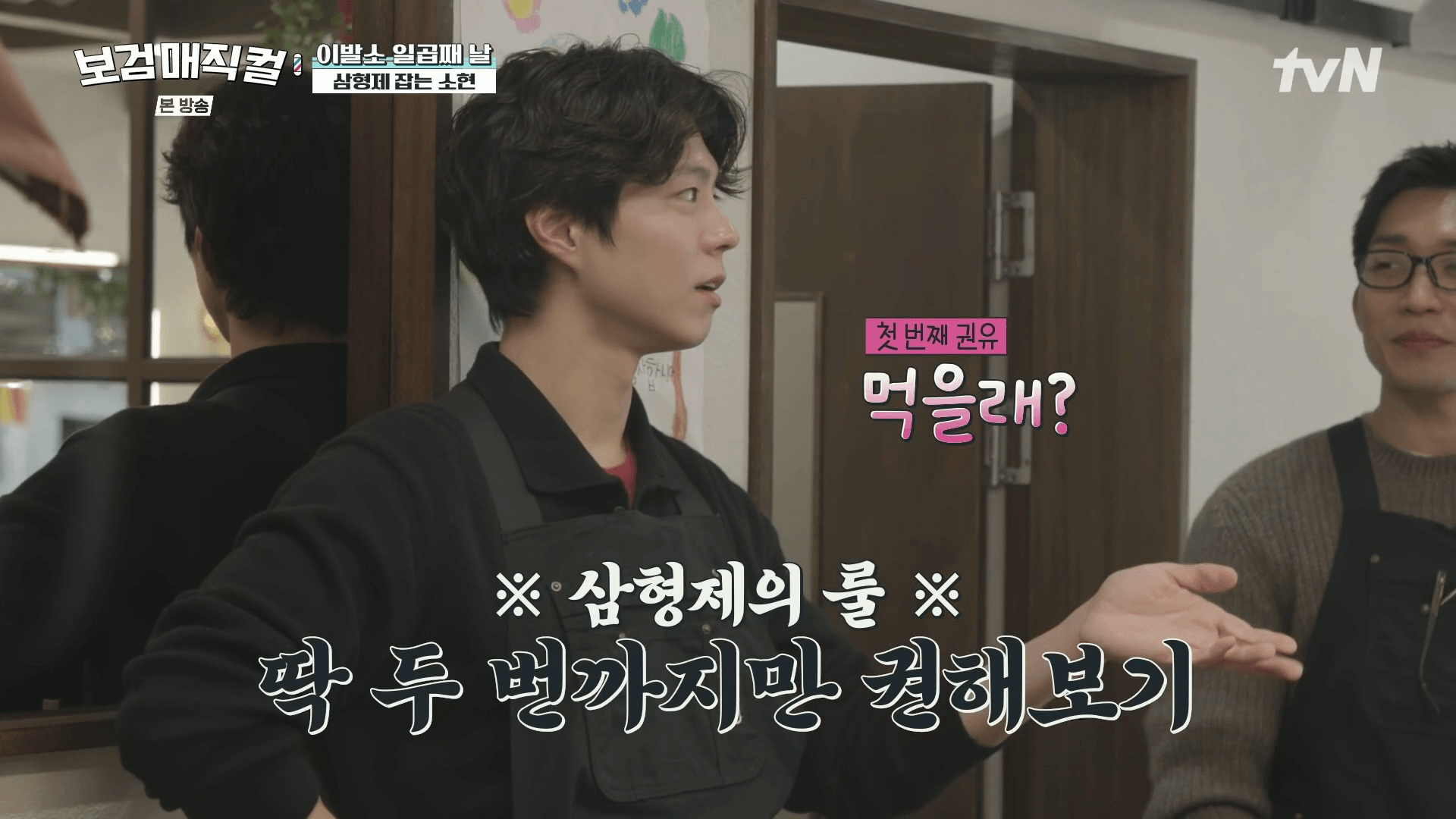 보검매직컬 멤버들인 '검동이 삼형제'는 지혜로운 단체 생활을 위해 특별한 룰을 만들었습니다. 바로 무언가를 권유하거나 대화할 때 '딱 두 번까지만 권하기'입니다. 예를 들어 음식을 먹을 때도 "먹을래? 먹을래?"라고 두 번만 묻고, 그 이상의 부담을 주지 않는 것이죠.